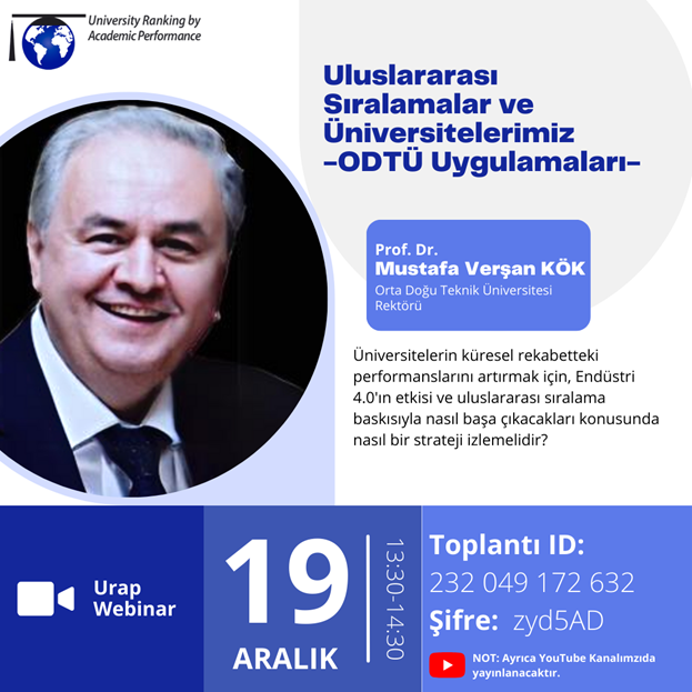 URAP Webinar Serisinde bu ay Orta Doğu Teknik Üniversitesi Rektörü Prof. Dr. Mustafa Verşan KÖK, “Uluslararası Sıralamalar ve Üniversitelerimiz -ODTÜ Uygulamaları-” hakkında bir seminer verecektir. Seminer Microsoft Teams platformunda ve sunum dili Türkçe olarak gerçekleştirilecektir. Bu konuya ilgi duyan herkes davetlidir.