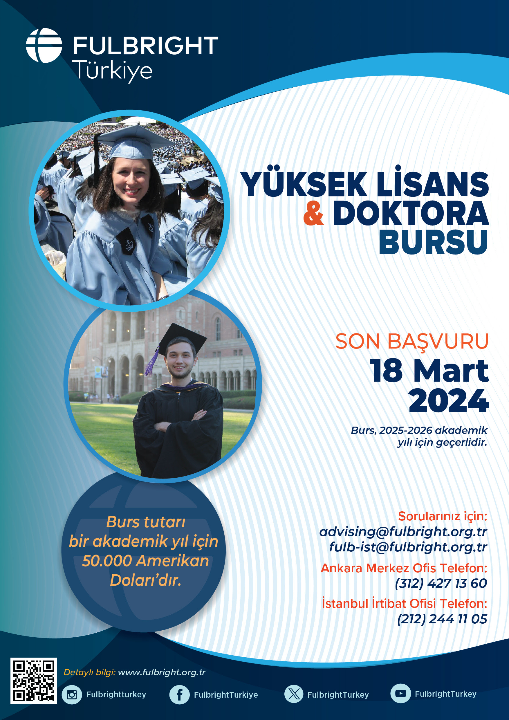 Komisyonumuz, lisansüstü eğitimlerini Amerika Birleşik Devletleri’nde yapmak isteyen öğrencilere ve mezunlara yönelik olarak Yüksek Lisans ve Doktora Bursları vermektedir. 2025-2026 akademik yılı güz döneminde başlamak üzere verilecek olan burslarımıza son başvuru tarihimiz 18 Mart 2024’tür.