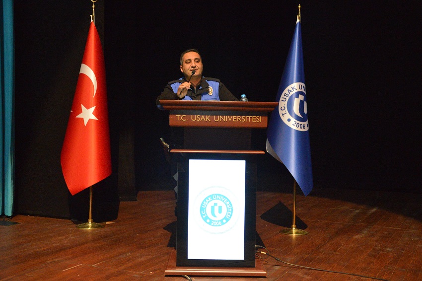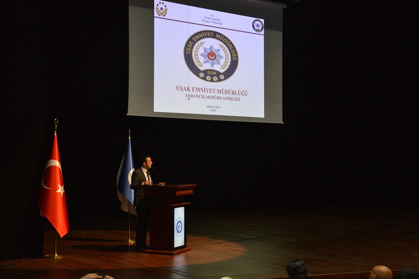 Uluslararası öğrencilerin karşılaşabileceği herhangi bir güvenlik sorununda yapmaları gerekenler hakkında bilgi veren Uşak İl Emniyet Müdürlüğünden Komiser Bekir Ender Atlay ve Polis Memuru Mutlu Tuna, Emniyet Müdürlüğü’nün Yabancılar Büro Amirliği tarafından yapılan çalışmalarını anlattı.