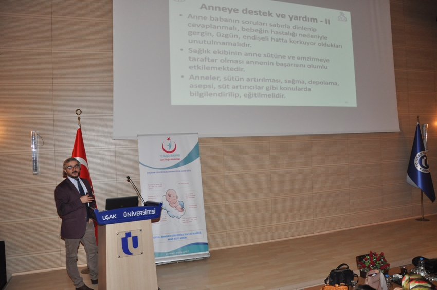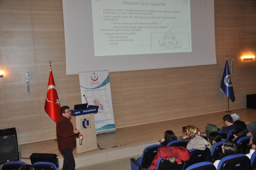 Mustafa Kemal Paşa Amfisi’nde, Uşak Sağlık Yüksekokulu hemşirelik öğrencilerine yönelik gerçekleşen eğitimde, Uşak Üniversitesi Halk Sağlığı Hizmetleri Başkan Yardımcısı Dr. Betül İlbey, Birim Uzmanı Dr. Mehmet Fatih Arslan, Uşak Özel Medical Park Hastanesi Dr. Selçuk Gürel, Sivaslı Toplum Sağlığı Merkezi Sorumlu Hekimi Dr. Emine Uysal, Eşme İlçe Sağlık Müdürlüğü Sağlık Memuru Bülent Akay, İl Sağlık Müdürlüğü ÇEKÜS Birim çalışanları Ebe Meral Duran, Ebe Sibel İncedağ tarafından ‘Anne Sütü ve Emzirme Danışmanlığı’ eğitimi verildi. Konuşmacılar anne sütü ve emzirmenin yararları ve hemşirelerin bu alandaki danışmanlık hizmeti, görev ve sorumlulukları hakkında bilgiler aktardı.