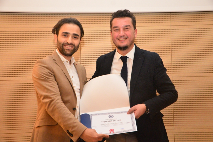 Etkinliğin sonunda Mezunlar Ofisi ve Kariyer Geliştirme Koordinatörü Dr. Öğretim Üyesi Eser Yeşildağ, Dr. Öğretim Üyesi Umut Eroğlu’na teşekkür belgesi verdi.