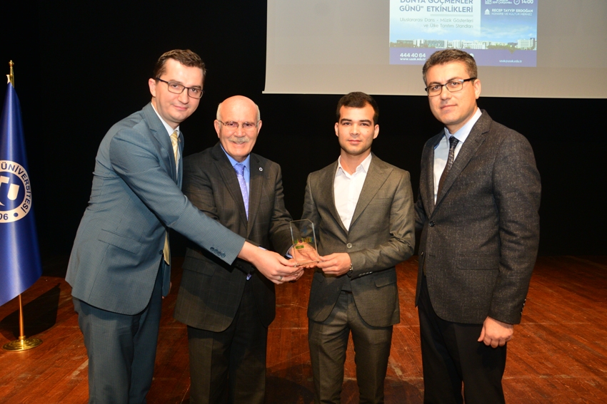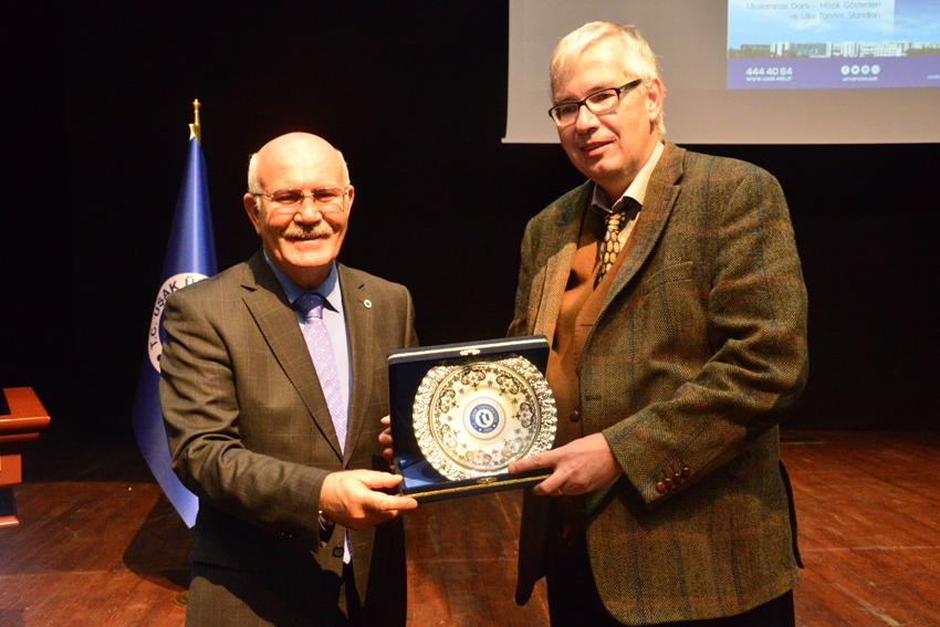 Konuşmaların ardından Prof. Dr. Rainer Maria Czichon ve derslerinde üstün başarı gösteren Uşak Üniversitesi Mimarlık ve Tasarım Bölümü Öğrencisi Türkmenistanlı Azat Saparov’a, Rektör Prof. Dr. Ekrem Savaş tarafından plaket verildi.