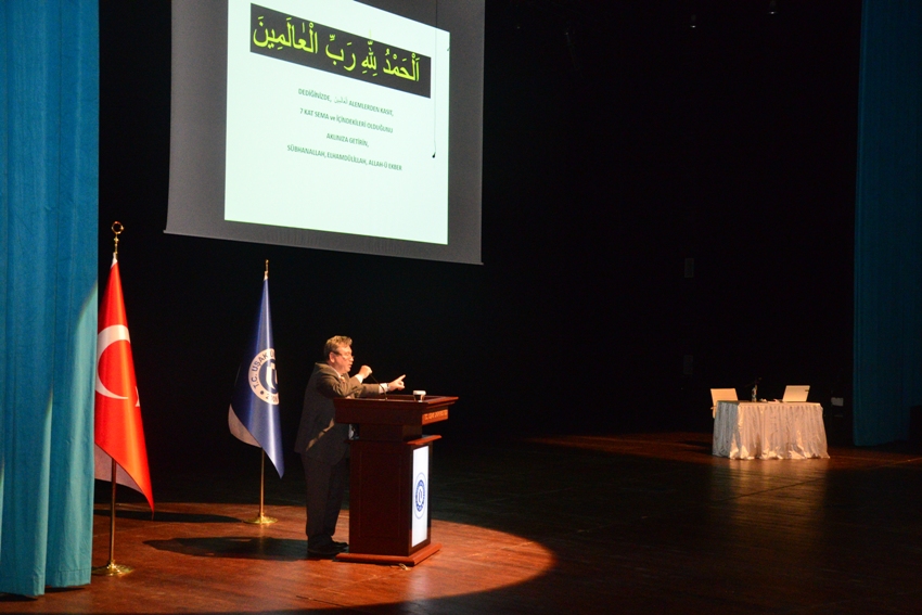 Prof. Dr. Eker, 'Modern Bilim Penceresinden Çağdaş Bir Astrofizikçi Gözüyle Yedi Kat Sema' adlı sunumunu gerçekleştirdi. Eker, modern teknolojiyle birlikte gelişen ve değişen bilimsel çalışmalardan yola çıkarak uzay bilimleri, dünya atmosferi, gezegenler güneş sistemi ve samanyolu hakkında bilgi verdi. Eker, evrende her şeyin rastgele yer almadığını, galaksilerin belirli bir düzene göre var olduğunu belirterek, konuşmalarını bilimsel bilgiler ve Kur'an-ı Kerim'den ayetlerle destekledi.