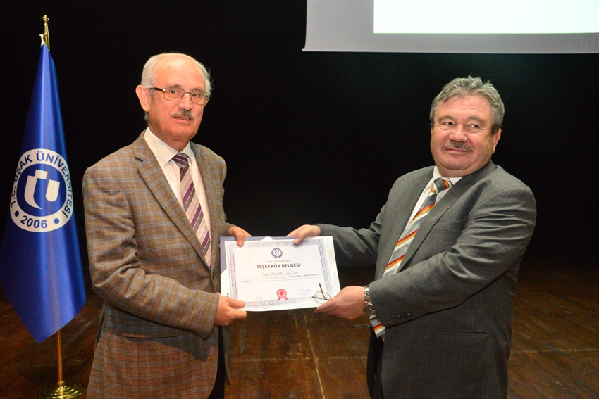 Program soru cevap bölümünün ardından, Prof. Dr. Zeki Eker'e, Dekan Prof. Dr. Ali Yılmaz tarafından teşekkür belgesi takdim edilmesiyle son buldu.