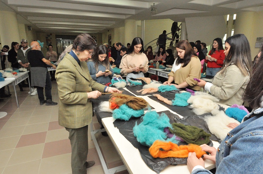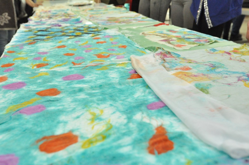 ve öğrencilere keçe yapımı uygulamalı olarak gösterilirken, katılımcılar keçe