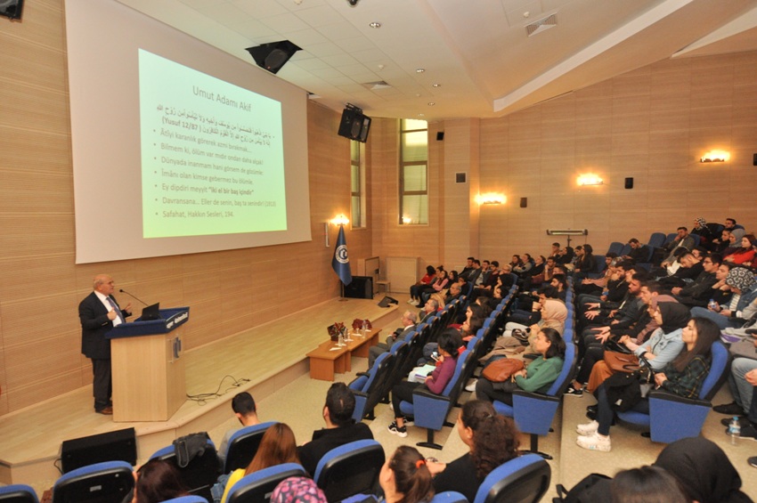 Açılış konuşmasının ardından İslami İlimler Fakültesi Temel İslami Bilimler Bölümü Öğretim Üyesi Prof. Dr. Hüseyin Yaşar ‘Hakk’ın Sesi Mehmet Akif Ersoy ve İstiklal Marşı’ adlı konferans verdi. Mehmet Akif Ersoy’un, bu milletin istikbali için heyecanlanan ve coşan bir değer olduğunu belirten Prof. Dr. Yaşar, “Akif’in temel özellikleri var. Örneğin; bilgisi, İnancı ve ameli yüzde yüz uyuşan tutarlı bir insan. Onun hayatında tutarsızlığa yer yok. Onu hayatta tutan şey ise umut. İstiklal Marşı’nın başında bunun için ‘Korkma!’ diyor. Bu bir emir. O günkü imkanlar ve imkansızlıklar içerisinde düşündüğümüzde büyük bir umut. O söz o gün meclise, bugün hepimize söylenmiştir” diye konuştu.