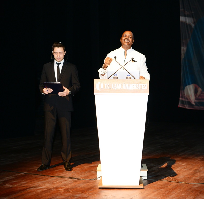 Konferansın açılış konuşmasını yapan Rektör Vekilimiz Prof. Dr. Sayın Dalkıran, Ruanda Ankara Büyükelçisi Williams Nkurunziza’yı Uşak Üniversitesi’nde ikinci kez misafir etmekten duyduğu memnuniyeti dile getirerek “Üniversitemizin bu güzide mekanında, Recep Tayyip Erdoğan Kongre ve Kültür Merkezimizde, bugün üçüncü etkinliğimizi gerçekleştiriyoruz. Yoğun bir katılım var. Sevgili gençler derslerin telafisi mümkün ancak yıllarca süren emeğin birkaç saatte aktarıldığı bu tür etkinlikler de çok önemli. Bugün ki misafirimiz Ruanda Ankara Büyükelçisi Williams Nkurunziza, üniversitemize daha önce ziyaret ettiğinde üniversitemizi çok beğendiğini ve bir daha ki sefere öğrencilerimizle bir araya gelmek istediklerini söylemişlerdi. Davetimizi yineledik ve Milletvekilimiz Sayın Dr. Alim Tunç’un katkılarıyla sadece Ruanda Ankara Büyükelçimiz değil Afrika’nın güzide 21 ülkesinin büyükelçileri de Uşak’ımıza geldiler. Yarın bu büyükelçilerimiz Uşak’ı tanıyacaklar. Kültürel, ekonomik ve siyasi anlamda işbirlikleri yapılacak. Biz, Türk Milleti olarak, asla ve asla, bir ülkeyi işgal etmek gibi sömürmek gibi bir niyetimiz olmamıştır. Tarihimiz bunun şahididir. Bizim ecdadımız Afrika’nın en güneyine kadar gitti. Oralarda kültürümüzü paylaştılar. Lakin Batılı ülkeler o günlerde buna müsaade etmemeye çalıştı hatta bugün de aramızdaki muhabbeti koparmaya çalışıyorlar. 15 Temmuz hain darbe girişimi, bizim Afrika’nın en güneyine kadar gitmemiz, onlarla gönül bağı oluşturmamız, onlarla ekonomik ve siyasi bağlar kurmamız, işbirlikleri yapmamız, sadece Afrika değil tabi dünyanın dört bir bucağında bayrağımızın ve İslam’ın gitmesi Batılıları tabiri caizse adeta çıldırttı. 30 küsur yıldır çalıştıkları ve idaresi de onlarda olan, asla ve asla yerli ve milli olmayan bir grupla dini kullanarak, dini sömürerek bizi perişan etmek istediler. Dolayısıyla Afrika ve diğer ülkelerle olan ilişkilerimizi bitirmeye çalıştılar. Allah’a çok şükür, milletimiz, siz sevgili gençler ve Cumhurbaşkanımız Sayın Recep Tayyip Erdoğan sayesinde onlara darbeyi vurduk. Bugün aramızda olan Ruanda Ankara Büyükelçisi Williams Nkurunziza’ya teşriflerinden dolayı, Milletvekilimiz Sayın Dr. Alim Tunç’a büyük katkılarından dolayı teşekkür ediyorum.”dedi.