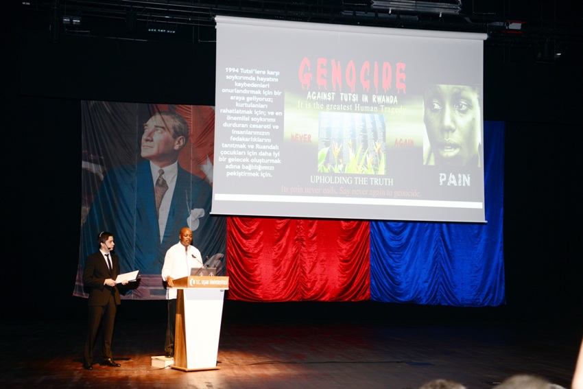 Uzun yıllar mülteci olarak yaşamını sürdürdüğünü aktaran Ruanda'nın Ankara Büyükelçisi Williams Nkurunziza, Belçika tarafından sömürülen ülkesinde ekonomik sınıflara ayrılan insanların, zamanla fiziksel özelliklerine göre kabilelere ayrıştırıldığını söyleyerek “Sadece seyrettiler. Sömürgeden kurtulan ülkemde 1994 yılında kaos ortamı çıkartılarak 1 milyon insanın öldüğü bir soykırım süreci yaşandı. 100 günde ülkemde 1 milyon kişi öldü, 300 bin kadın tecavüze uğradı, çocuklar annesiz babasız kaldı ve bütün bunlar yaşanırken gelişmiş ülkeler sadece yaşananları seyretti. 1994 yılından sonra toparlanma sürecine girdik ve bugün Afrika'nın en güvenli ülkesi haline geldik. Ruanda ile Türkiye arasındaki ilişkiler her zamankinden daha güçlü. Biz bu ilişkilerin daha da güçlenmesini istiyoruz. Sayın Cumhurbaşkanı Recep Tayyip Erdoğan'ın Afrika ülkeleri ile ilgili çalışmalarını yakından takip ediyoruz ve çok önemsiyoruz. Ekonomik alanda ilişkilerin güçlenmesi iki ülkeye de fayda sağlayacak. Uşak’ta ve üniversitenizde olmaktan mutluluk duyuyorum. Başta Milletvekili Alim Tunç ve Rektör Vekili Prof. Dr. Sayın Dalkıran olmak üzere herkese ve öğrencilere teşekkür ediyorum"dedi.