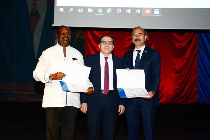 Ruanda Ankara Büyükelçisi Williams Nkurunziza’nın konuşmacı olduğu “Ruanda’da Tarihi ve Mevcut Gelişmeler” adlı konferansın sonunda Rektör Vekilimiz Prof. Dr. Sayın Dalkıran, Ruanda Ankara Büyükelçisi Williams Nkurunziza ve TBMM Ruanda Dostluk Grubu Başkanı ve AK Parti Uşak Milletvekili Alim Tunç’a teşekkür belgesi takdim etti.