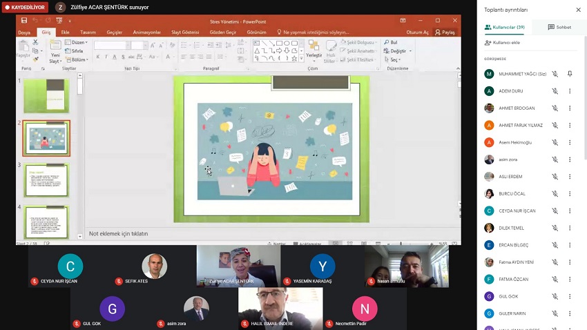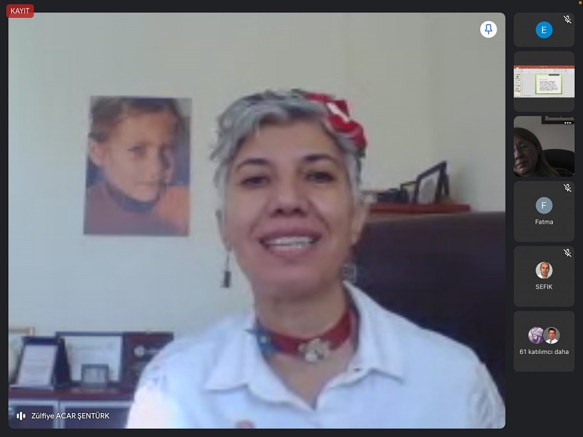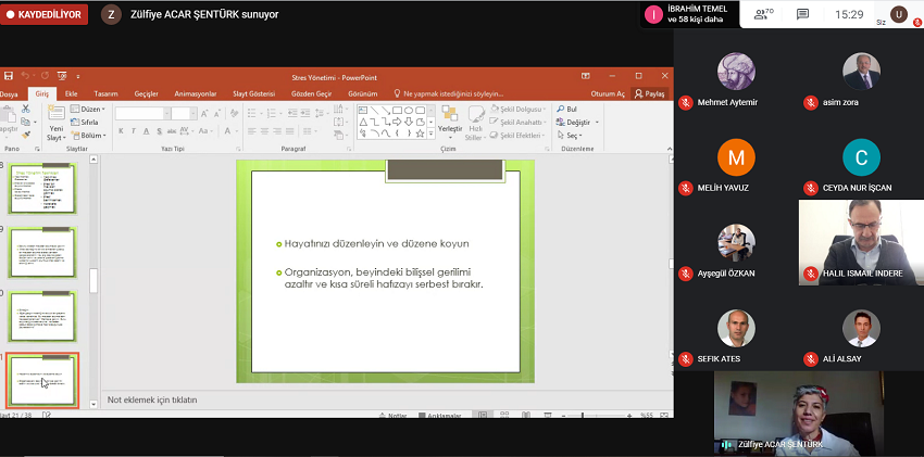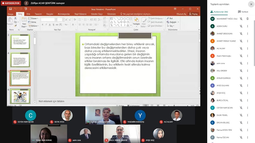 Çevrimiçi (online) gerçekleşen eğitime Eşme Meslek Yüksekokulu Müdürü İletişim Fakültesi Öğretim Üyesi Doç. Dr. Zülfiye Acar Şentürk konuşmacı olarak katıldı. Doç. Dr. Şentürk, stresin ne olduğu, etkileri ve stresle başa çıkma yöntemleri hakkında bir sunum yaparak, soruları cevapladı.
