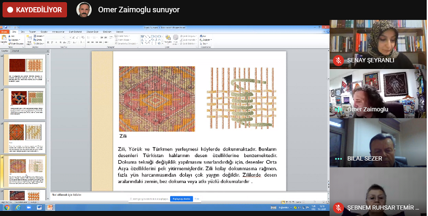 Konuşmasında görsellere de yer veren Doç. Dr. Zaimoğlu, Türk kültüründe çadırların, yarı göçebe hayatı yaşayan Türklerin, sembolü haline gelmesinin, Türk sanatının sembolik öğelerinin oluşmasına vesile olduğunu belirtti. Sığ dokumayı (kamış dokuma) genel olarak Kazakların kullandığını ve görsel anlamda iç kısımların kaplama ve havalandırma görevi gördüğünü bunun için de genellikle keçi kılının kullanıldığını anlatan Zaimoğlu, Uşak halılarının önemine değindi.