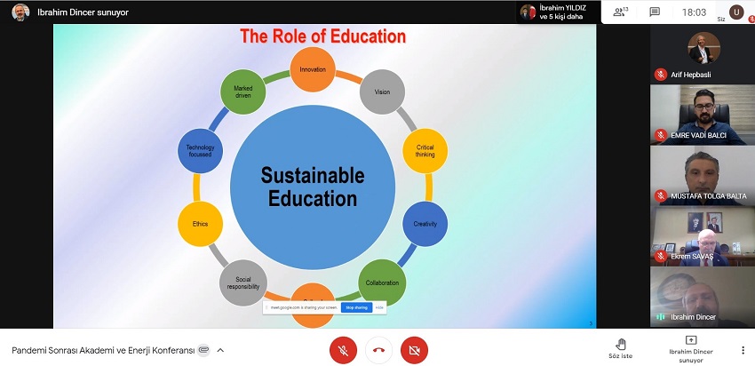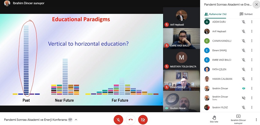 “Pandemi Sırasında ve Sonrasında Akademi ve Enerji” başlıklı bir sunum gerçekleştiren Prof. Dr. Dinçer, ‘Eğitimin Rolü, Küresel Problemler, Mühendislik Niçin Önemlidir? ve Boyutları Nelerdir?, Niçin İnovasyon?, Sürdürülebilirlilik ve Enerji’ konularında bilgiler verdi.