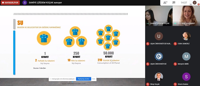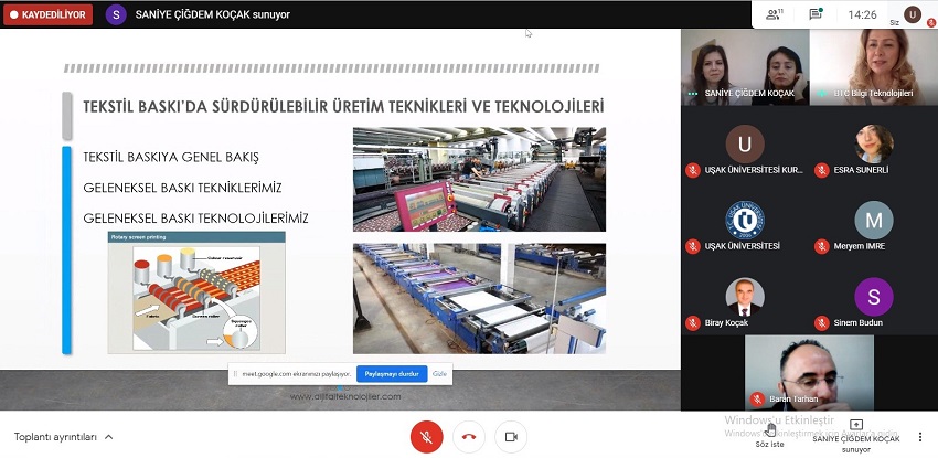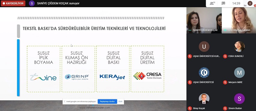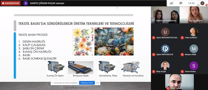 Uşak Üniversitesi Deri, Tekstil, Seramik (DTS) Tasarım Uygulama ve Araştırma Merkezi tarafından, BTC Bilgi Teknolojileri Genel Müdürü Nurten Ergün’ün konuk olduğu, “Tekstil Baskıda Sürdürülebilir Üretim Teknikleri ve Teknolojileri” konulu çevrimiçi söyleşi gerçekleştirildi.