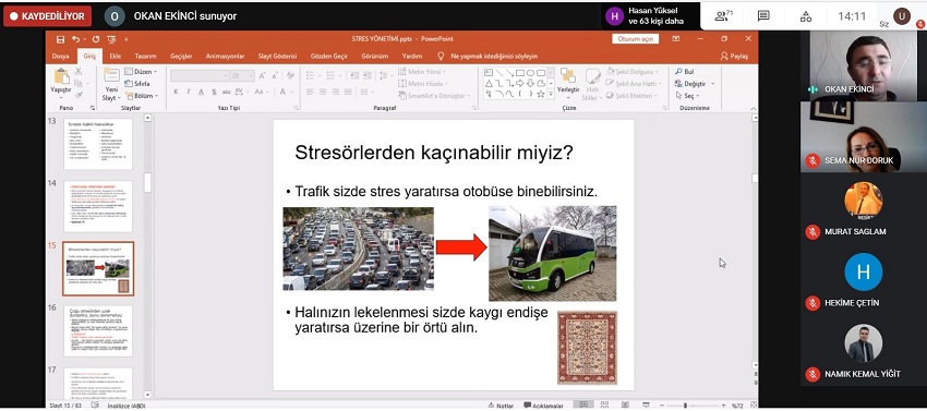 Tıp Fakültesi Psikiyatri Anabilim Dalı öğretim üyesi Doç. Dr. Okan Ekinci tarafından verilen hizmet içi eğitimde, “Stres Nedir?, Strese Neden Olan Faktörler-Kaynaklar, Stres Belirtileri, Stresle İlişkili Hastalıklar, Stresi Nasıl Yönetmek Gerekir?, Stres Yapan Stresörlerden Nasıl Kaçınabiliriz?, Zaman Nedir? Zaman Türleri, Zaman Yönetimi Nedir? Neden Önemlidir?, Zaman Yönetimi Yaklaşımları, Zamanı etkili ve Verimli Kullanmak için Neler Yapılmalı?, ile ilgili bilgiler verildi.