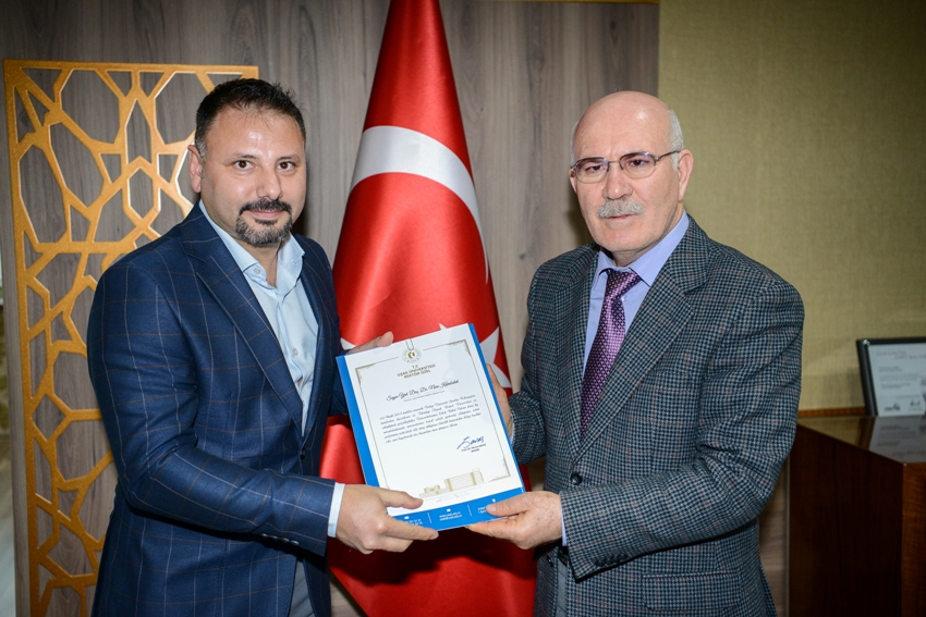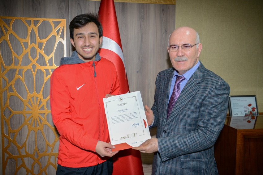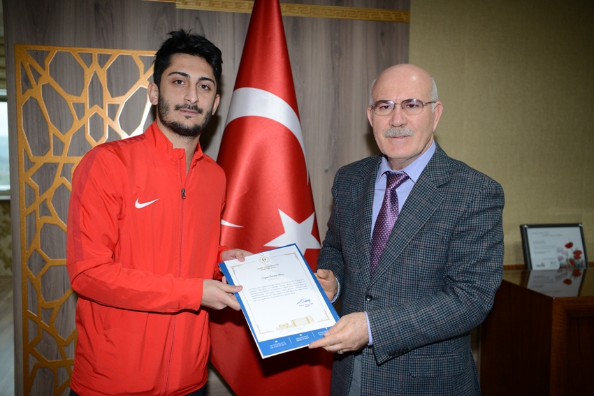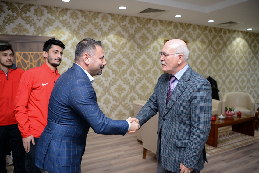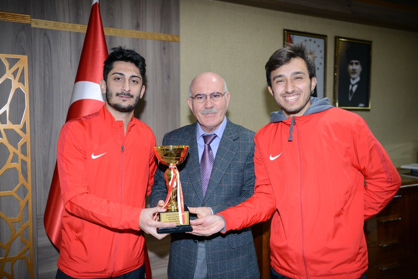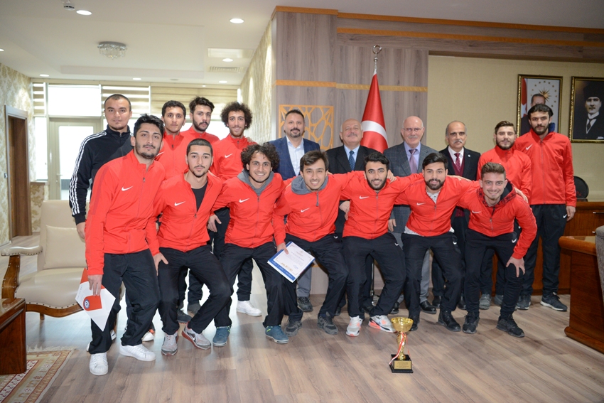 Rektörümüz Prof. Dr. Ekrem Savaş, Spor Bilimleri Fakültesi Öğretim Üyesi ve Erkek Futbol Takımımızın Antrenörü Yrd. Doç. Dr. Nuri Karabulut’u ve Futbol Takımımızı, Rektörlük Makamında kabul etti.