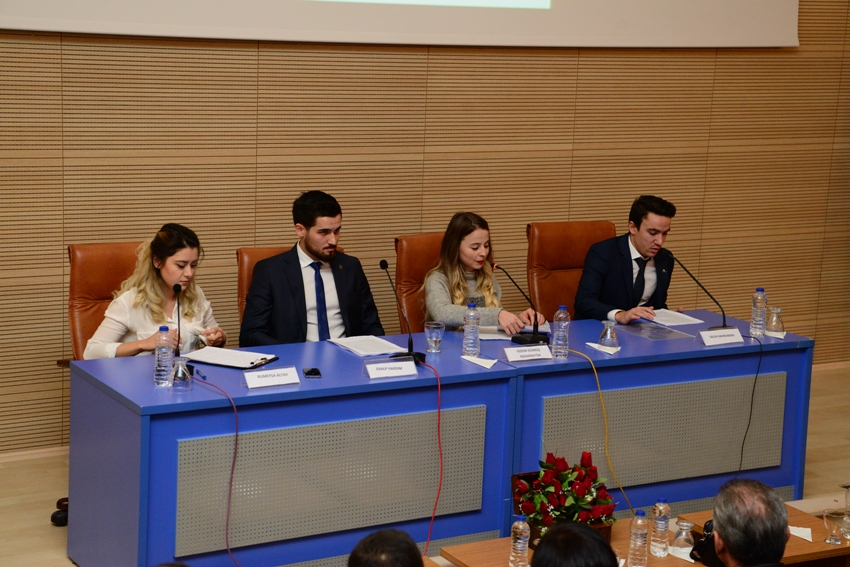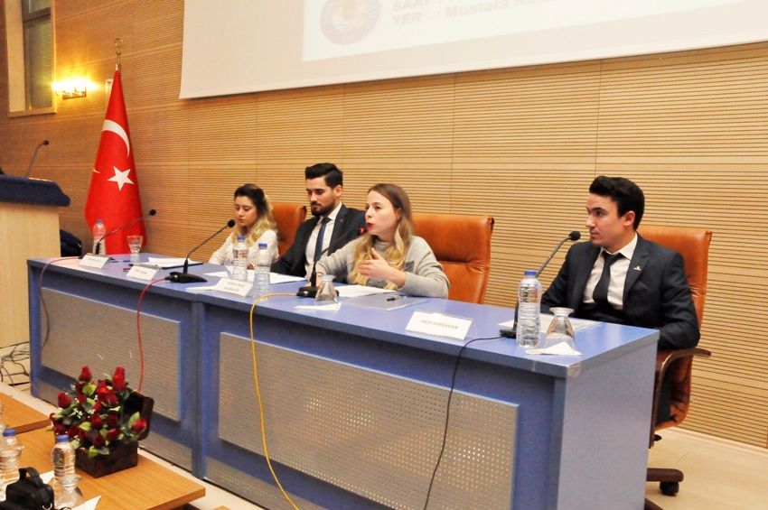 Konuşmacıların üniversitemiz öğrencisi olduğu “Gençlerin Gözünden Atatürk ve Cumhuriyet” adlı panelinin başkanlığını üniversitemiz Fen Edebiyat Fakültesi Tarih Bölümü öğrencisi Gizem Gümüş yaparak “Atatürk ve Cumhuriyet” konulu sunumunu gerçekleştirdi. Panelistler Fen Edebiyat Fakültesi Tarih Bölümü öğrencisi Salih Kahraman “Atatürk’ün Askeri ve Devlet Adamlığı”, Fen Edebiyat Fakültesi Sosyoloji Bölümü öğrencisi Rümeysa Altay “Atatürk, Cumhuriyet ve Eğitim” ve İktisadi ve İdari Bilimler Fakültesi İşletme Bölümü öğrencisi Eralp Yardım ise “Atatürk, Cumhuriyet ve Ekonomi” konulu sunumlarını gerçekleştirdiler.
