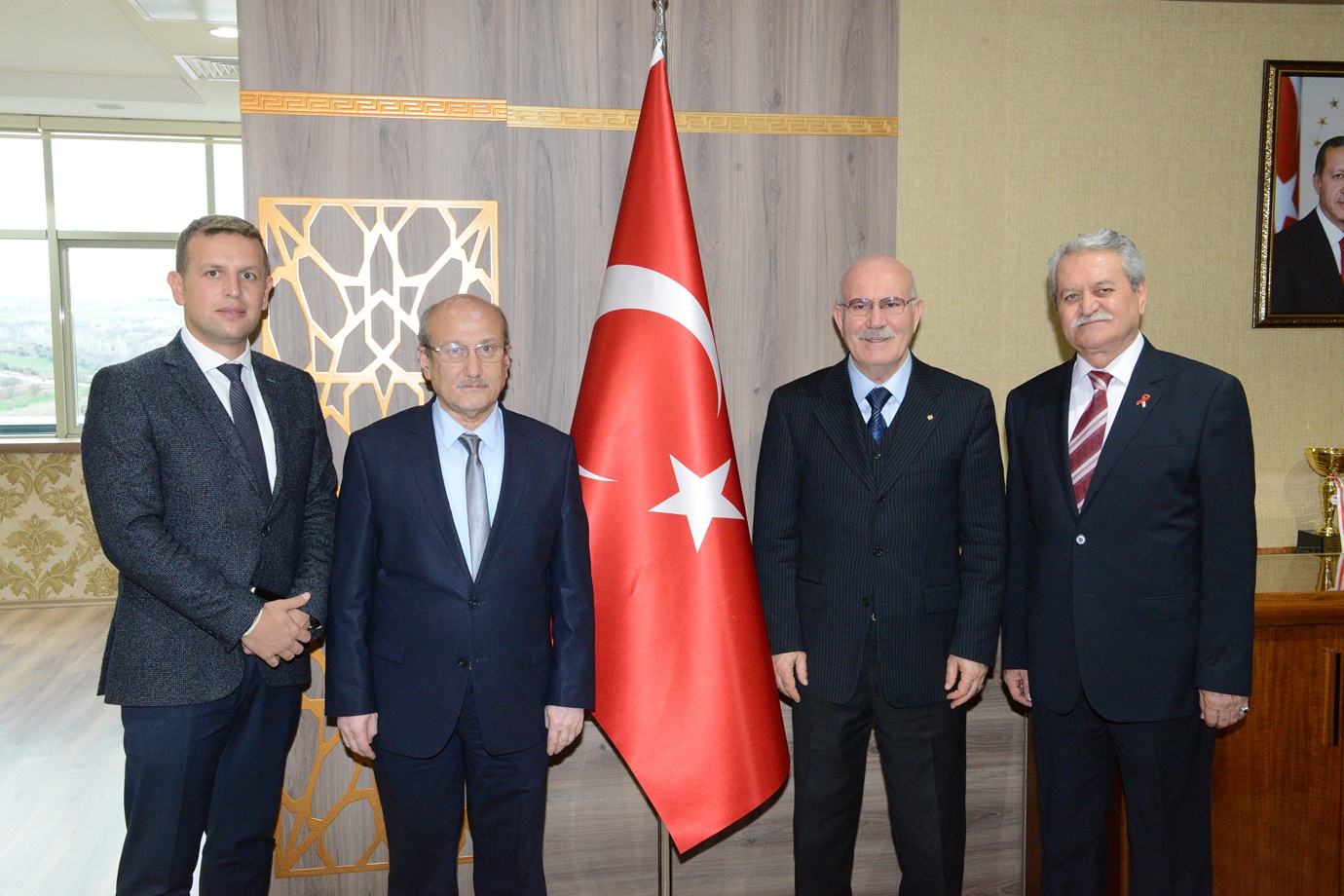 Denizli Güney Ege Kan Merkezi Müdürü İbrahim Ünlü ve Bölge Planlama Sorumlusu Murat Özkan, Uşak Kan Merkezi Müdürü Dr. Umut Bilgin Koçak Rektörümüz Prof. Dr. Ekrem Savaş'a hayırlı olsun ziyaretinde bulundular