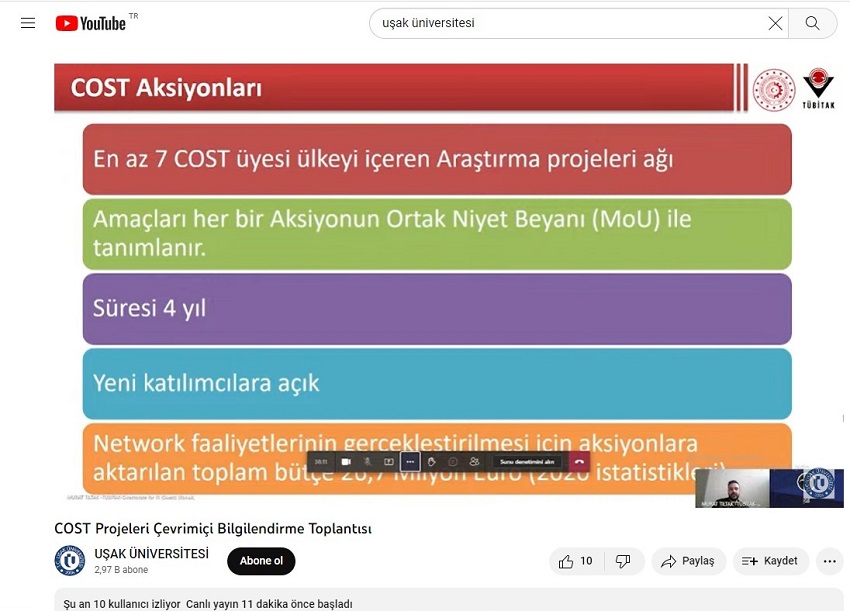 Uşak University Faculty of Economics and Administrative Sciences Department of Public Administration held an online information meeting titled "COST Projects" with the participation of TÜBİTAK Bilateral and Multiple Relations Directorate Scientific Programs Specialist Murat Tiltak as a speaker within the scope of 9 May Europe Day and the 100th Anniversary of the Republic.