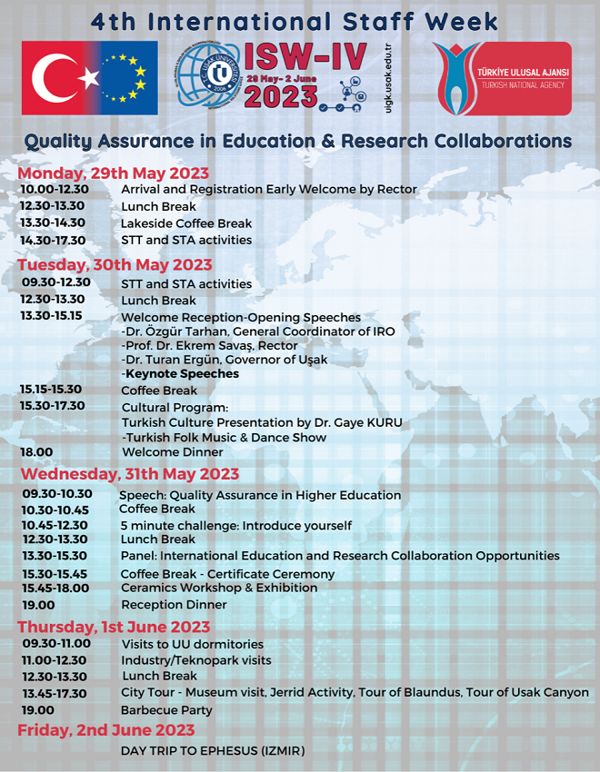 Uşak Üniversitesi Uluslararası İlişkiler Genel Koordinatörlüğü bünyesinde gerçekleştirilen Uşak Üniversitesi Uluslararası Hafta (International Staff Week) etkinliğinin 4.’sü, bu yıl "Quality Assurance in Education & Research Collaborations" temasıyla 29 Mayıs 2023 - 02 Haziran 2023 tarihlerinde gerçekleştirilecek.