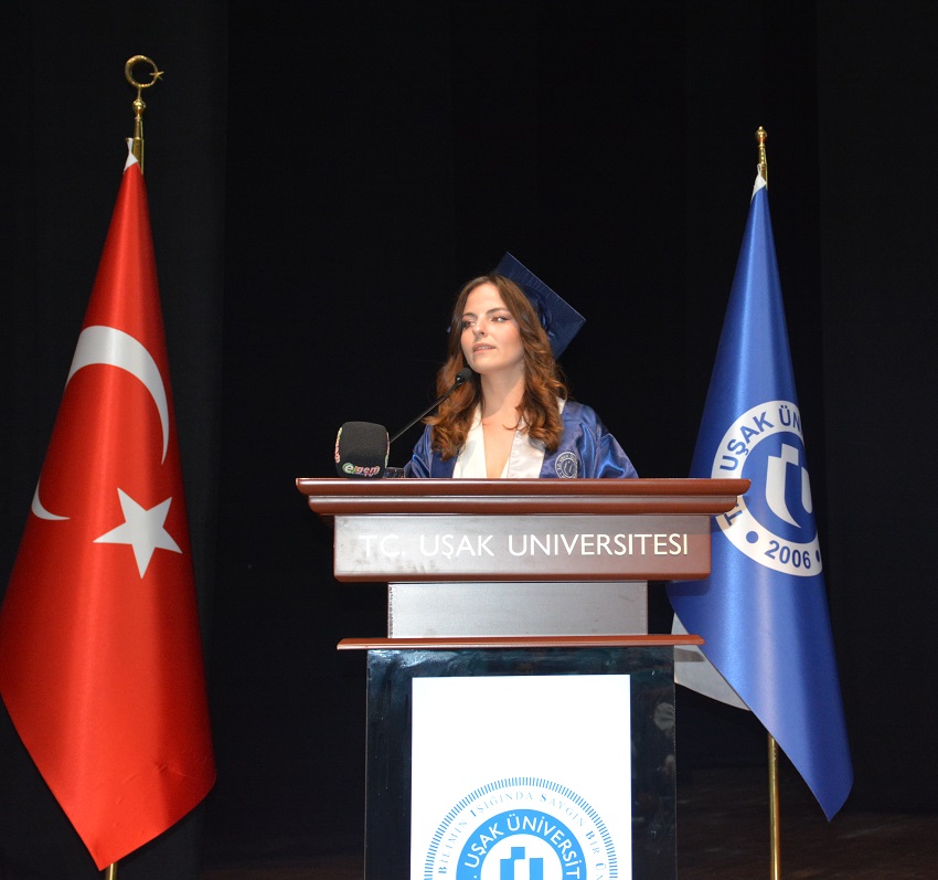 Tıp Fakültesi Dekan Vekili Prof. Dr. Rahşan Ilıkçı Sağkan törenin açılış konuşmasında Uşak Üniversitesi Tıp Fakültesi Dekanı Prof. Dr. Tufan Mert’in mesajını okudu. Mezunlara seslenen Prof. Dr. Sağkan “Sağlık hizmetlerine erişimi geliştiren hekimlik mesleğinin geleceğini şekillendiren seçkin mezunlar grubuna katılıyorsunuz. Bunun toplum nezdindeki önemini ve saygınlığını yaşayarak göreceksiniz. Bu saygınlığın omuzlarınıza yükleyeceği sorumluluğun gerekliliklerini unutmadan meslek hayatınızı sürdüreceğinizden şüphem yoktur. Bizler, Uşak Üniversitesi Tıp Fakültesi akademik kadrosu olarak, genç hekimler yetiştirerek aziz milletimize hizmet etmeye devam edeceğiz. Bugün mezun ederek uğurladığımız genç hekimlerimizin gerek gördükleri her zaman yanlarında olmaya devam edeceğiz. Burada yeri gelmişken bizlere bu olanakları sağlayan sayın rektörümüze, fakülte yöneticilerimize, öğretim üyelerimize, idari personelimize ayrı ayrı teşekkür eder, her birine şükranlarımı sunarım” dedi.