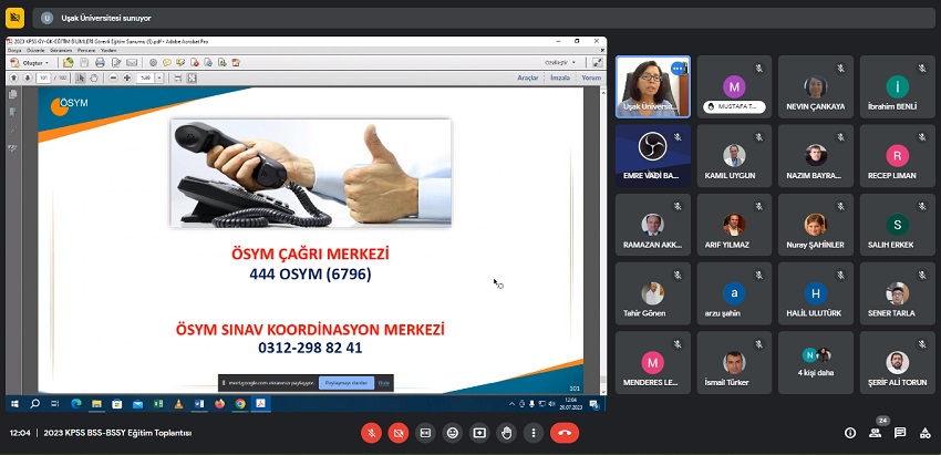 Toplantının ardından 20 Temmuz tarihinde, 2023 KPSS için Uşak Üniversitesi ÖSYM İl Sınav Merkezi Koordinatörlüğü tarafından çevrimiçi “Görevli Eğitimi” gerçekleştirildi. Eğitimde Sınav Organizasyon Koordinatörü Prof. Dr. Sadiye Tutsak tarafından, Bina Sınav Sorumluları ve Bina Sınav Sorumlusu Yardımcılarına yönelik, 23 Temmuz 2023 tarihinde yapılacak Kamu Personel Seçme (KPSS) Lisans ile 6 Ağustos 2023 tarihinde yapılacak olan KPSS Öğretmenlik Alan Bilgisi (ÖABT) ve ÖABT İmam-Hatip Lisesi Meslek Dersleri Alanı Sınavı sınavları için, sınav öncesi, sınav günü ve sonrasında alınacak tedbirler ve önlemler ile ilgili bilgi verildi.