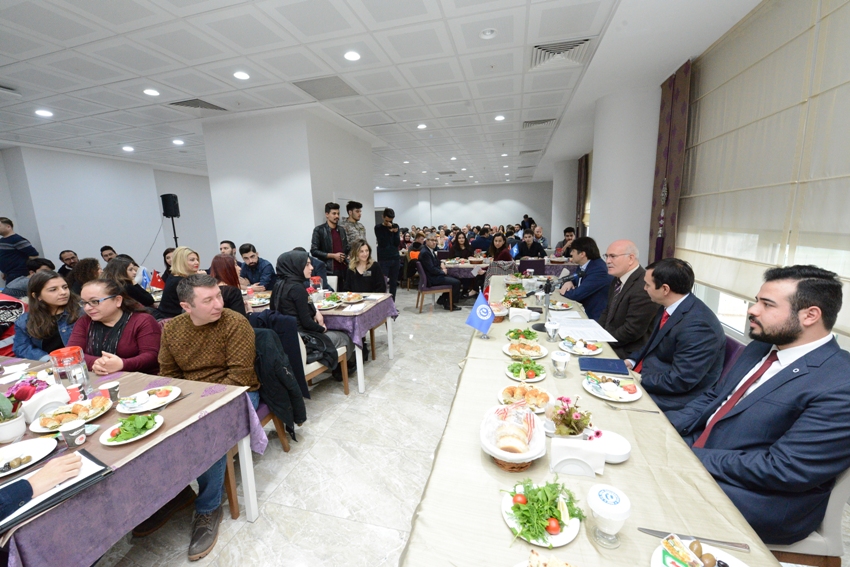 Gelişen teknolojinin gerekliliklerine ülke ve üniversite olarak yetişebilmek için çaba göstermemiz gerektiğini belirten Rektörümüz Prof. Dr. Ekrem Savaş konuşmasında şunları aktardı: “Biz çocukken büyüklerimize şunu söyle yapsak iyi olmaz mı dediğimizde bize ‘Otur oturduğun yerde başıma icat çıkarma.’derlerdi. Ancak bizim icat çıkaran arkadaşlara ihtiyacımız var, siz topluluklarımızdan icatlar bekliyoruz. Hem kampüsü geliştirecek hem ülkeyi geliştirecek yeni fikirler bekliyoruz. Mesela Robot Topluluğumuz var, bu topluluğumuzdan çok şey bekliyoruz. Önümüzdeki süreç robotlar devri olacak. Çünkü robotlar yapay zekayla hem öğrenme hem öğretme yeteneğine sahip olacaklar. Biliyorsunuz 7 Mart Çarşamba günü ‘Endüstri 4.0’ adlı bir konferans düzenliyoruz. Bu konferans öğrencilerimiz için son derece önemli. Marmara Üniversitesinden bir profesör arkadaşımız gelecek, katılmanızı tavsiye ederim. Değerli öğrenciler, sizler bizim için önemlisiniz, bu ülkenin geleceği için önemlisiniz, biz sizi iyi bir şekilde yetiştirmek zorundayız ve biz size üniversite olarak ancak yüzde 30 civarında bilgi yükleyebiliriz geri kalan yüzde 70’ini siz okuyarak ve çalışarak kazanacaksınız. Lütfen sosyal medyadan uzak durunuz, sabırlı olunuz ve çok kitap okuyunuz. Sosyal medya kısa zamanda sonuca götürdüğü için insanları sabırsız yapıyor. Ama bir kitabı okumak için bazen 3 gün bazen 4 gün sabretmeniz gerekiyor o nedenle bol bol kitap okuyun. Haftada 1, ayda 4 kitap okumanız gerekli diye düşünüyorum. Tüm bunları yaparken bir yandan da bu ülkenin değerlerini kaybetmemeniz lazım. Türk Milleti olarak biliyorsunuz, Çanakkale Savaşında 250 bin Sarıkamış’ta ise 90 bin şehit verdik. Yani bu ülke bu günlere kolay gelmedi ve biz o şehitlere layık olmazsak Cenab-ı Hak bize bunun hesabını sorar. Bugün burada rahat şekilde oturabiliyorsak, sınır ötesinde bugün çarpışıp şehit düşen erlerimize layık olmak zorundayız. Onlar orada bizler için canlarını verirken burada da bizler onlara layık olmak zorundayız. Çalışacaksınız çünkü çalışmaktan kimse ölmemiştir. Hiç çalışmaktan ölen bir kişi duydunuz mu? Lütfen bu ülkenin değerlerine layık olun, bu ülkenin yeteri kadar düşmanı var. Millet olarak sırt sırta olursak gelişmek bizim için kolay olur. Derslerinizde başarılı olacaksınız çok başarılı olacaksınız ki geleceğiniz de başarıları olsun. Sizlere çalışmalarınızda başarılar diliyorum.”