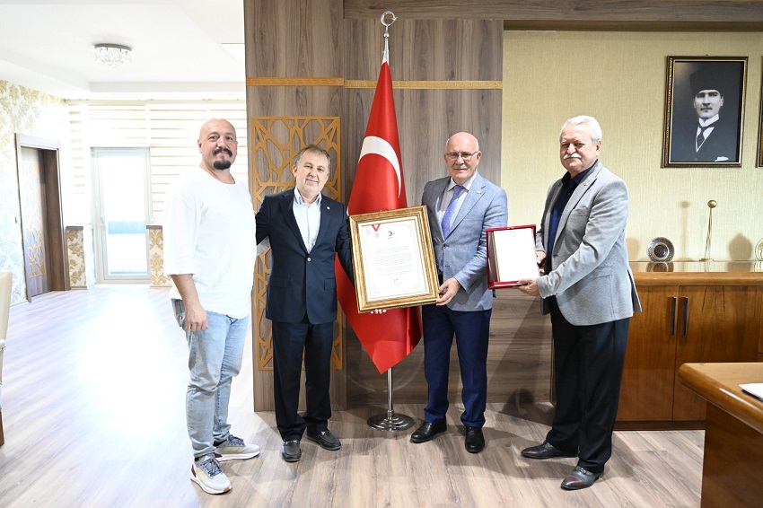 Plaket ve Madalya Beratı, Uşak Kan Bağışı Merkez Müdürü Dr. Umut Bilgin Koçak ve Güney Ege Kan Merkezi Müdürü Dr. Zafer Aydın tarafından Uşak Üniversitesi Rektörü Prof. Dr. Ekrem Savaş’a takdim edildi.