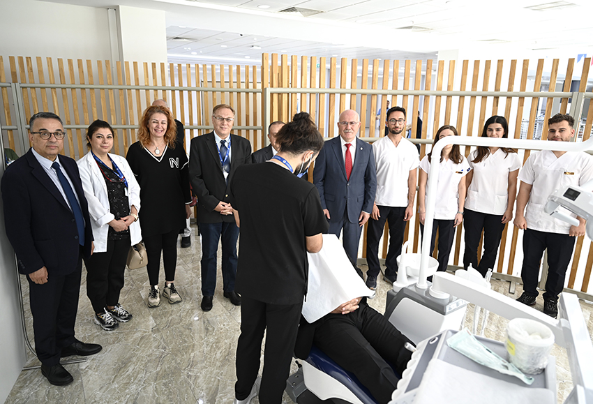 Diş hekimliği fakültesinin ağız içi muayene alanını ziyaret eden Uşak Üniversitesi Rektörü Prof. Dr. Ekrem Savaş, çalışmalar hakkında bilgi aldı.