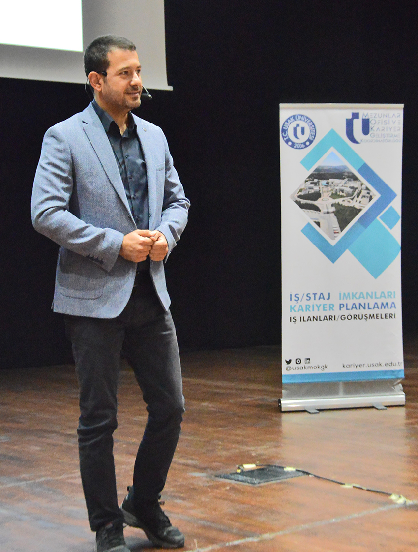 İŞKUR Uşak İl Müdürlüğü İş ve Meslek Danışmanı Nihat Talaycı yaptığı sunumda doğru CV hazırlamanın inceliklerinden iş görüşmesinde yapılacaklara kadar geniş bir alanda dinleyicilere bilgi verdi. Kendisinin de Uşak Üniversitesinin bir mezunu olduğunu ifade eden Talaycı, deneyimlerini ve tecrübelerini öğrencilerle paylaştı.