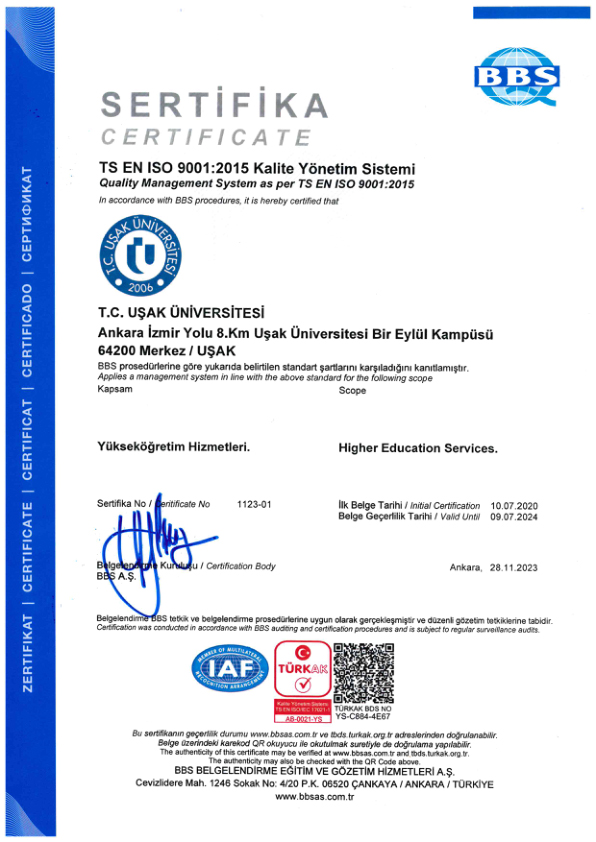 Uşak Üniversitesi, 2020 yılından beri aldığı TS EN ISO 9001:2015 Kalite Yönetim Sistemi Sertifikasını, bu yıl 10 Kasım 2023 tarihinde gerçekleştirilen dış tetkiki başarıyla tamamlayarak yeniden almaya hak kazandı.
