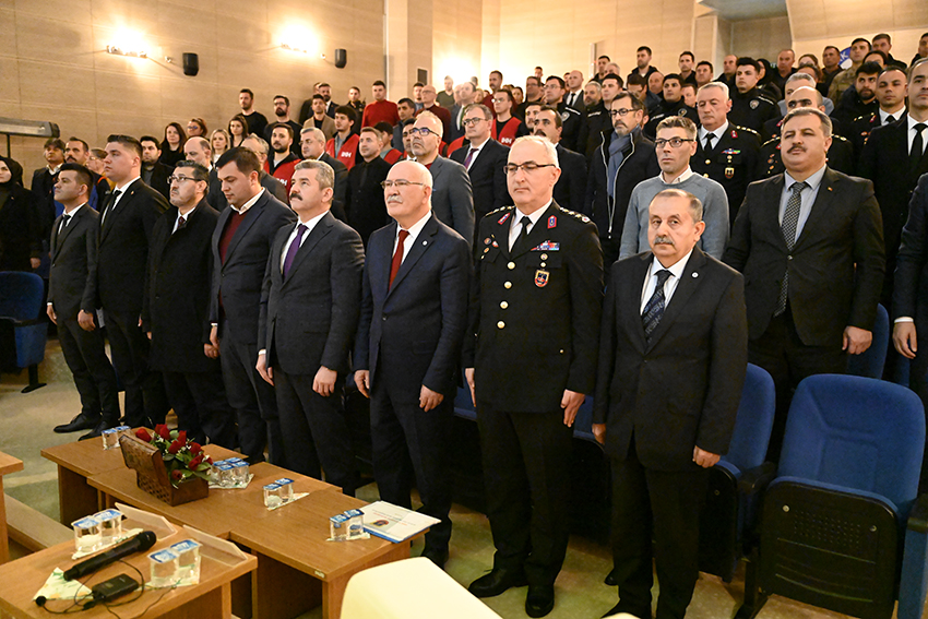 Vali Dr. Turan Ergün, yaptığı konuşmada, ‘‘Bundan tam bir yıl önce, ülkemizin 11 ilini derinden sarsan, büyük can kayıplarına ve şehirlerimizde yıkımlara yol açan 7.7 büyüklüğünde bir deprem yaşadık. 6 Şubat Depremleri 11 il, 124 ilçe, 6.929 mahalle ve köy ile birlikte 14 milyon vatandaşımızı doğrudan etkilemiştir. Bu depremlerde 53 bin 537 canımız yaşamını yitirmiş, 107 bin 213 vatandaşımız ise yaralanmıştır. Aramızdan ayrılan vatandaşlarımızı ve yine ülkemizde depreme yakalanarak hayatını kaybeden vatandaşlarımızı bir kez daha rahmetle anıyoruz. Mekanları cennet, ruhları şad olsun’’ dedi.