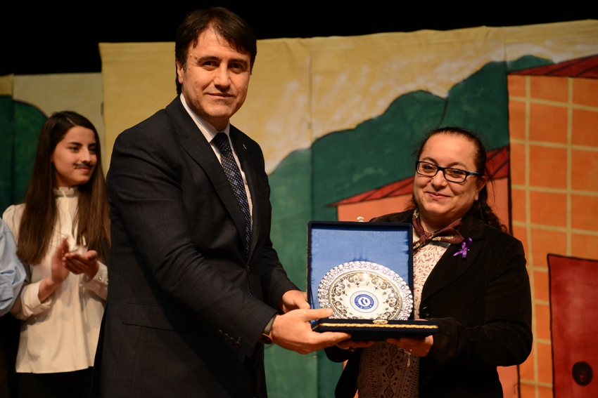 Üniversitemiz 8 Mart Dünya Kadınlar Günü etkinlikleri Sağlık Kültür ve Spor Daire Başkanlığına bağlı Tiyatro Topluluğumuz tarafından, Yönetmen Çağrı Gülerer yönetmenliğinde, Recep Tayyip Erdoğan Kongre ve Kültür Merkezinde sahnelenen Moliere'nin 'Kadınlar Mektebi' oyunuyla sona erdi. İlgiyle izlenen oyun sonunda Rektör Yardımcımız Prof. Dr. Metin Gümüş, Tiyatro Topluluğumuzun Danışmanı Üniversitemiz Eğitim Fakültesi Öğr. Gör. Nimet Gülerer'e teşekkür ederek plaket verdi ve yönetmen Çağrı Gülerer ile oyunda yer alan öğrencilerimizi tebrik etti.