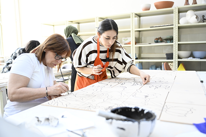 On the first day of the workshop, Gökhan Çalış gave presentations titled "The Story of a Product from Design to Brand" and Füsun Çövenoğlu gave presentations titled "Ceramic Panel Application with Colored Glaze Technique" and gave information about their works and shared their experiences with the participants.