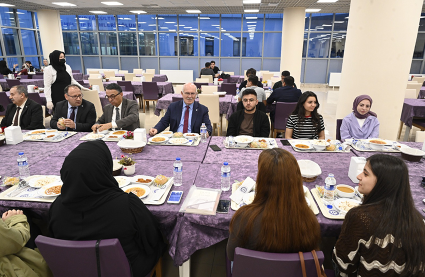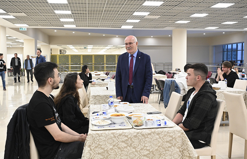 Rektör Prof. Dr. Savaş, iftar saatini bekleyen öğrencilerin masalarını gezerek, iftar öncesi onlarla bir süre sohbet etti. On bir ayın sultanı Ramazan ayının son günlerine gelindiğini belirten Rektör Savaş, “Mübarek Ramazan ayında öğrencilerimizle iftar sofralarında yeniden buluşmak ve onlarla aynı masada orucumuzu açmak bizleri çok mutlu ediyor. Bayrama kavuşmamıza az bir zaman kaldı. İnşallah gelecek yılda aynı sevinç ve heyecanla bir araya gelip birlikte iftar yaparız. Ramazan ayı vesilesiyle şunları da iletmek istiyorum; Ramazan ayının, tüm Dünya’da yaşanan olumsuzlukların, zulümlerin ve problemlerin çözüldüğü, açlığın, sefaletin ve yoksulluğun son bulduğu bir ay olmasını Yüce Rabbimden niyaz ediyor, tuttuğumuz oruçların ve yaptığımız ibadetlerin kabul olmasını diliyorum. Gelmekte olan Ramazan Bayramı’nın Milletimiz, İslam Âlemi ve tüm insanlık için hayırlara vesile olmasını Cenab-ı Hak’tan niyaz ediyorum. Gençlerimizin bayramını da şimdiden kutluyorum.” ifadelerini kullandı.
