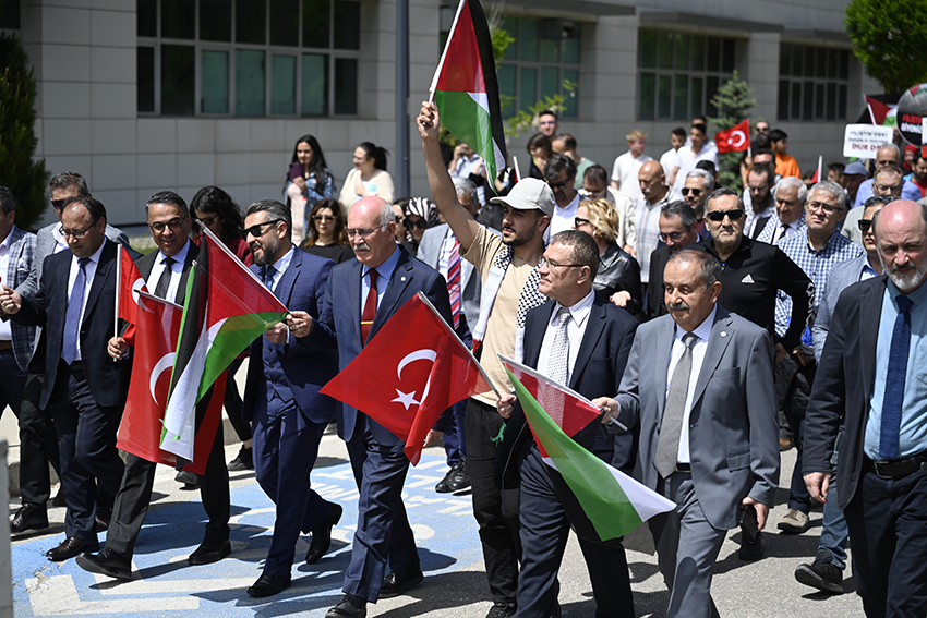 Uşak Üniversitesi Rektörlük önünden mehteran takımı ve atlı cirit ekibinin eşliğinde başlayan “Filistin’e Destek Yürüyüşü”ne Uşak Üniversitesi Rektörü Prof. Dr. Ekrem Savaş, akademik, idari personel, öğrenci toplulukları ve öğrenciler katıldı.