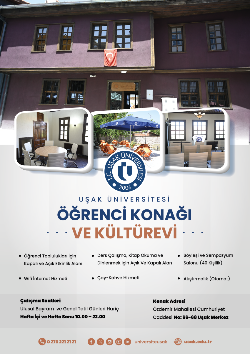 Tarihi Uşak evlerinden üniversiteye tahsis edilen Uşak Üniversitesi Öğrenci Konağı ve Kültürevi, donanımlı bahçesi ve iç mekânıyla öğrencilere ve personele çeşitli olanaklar sunuyor.
