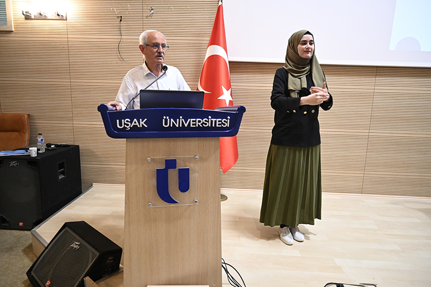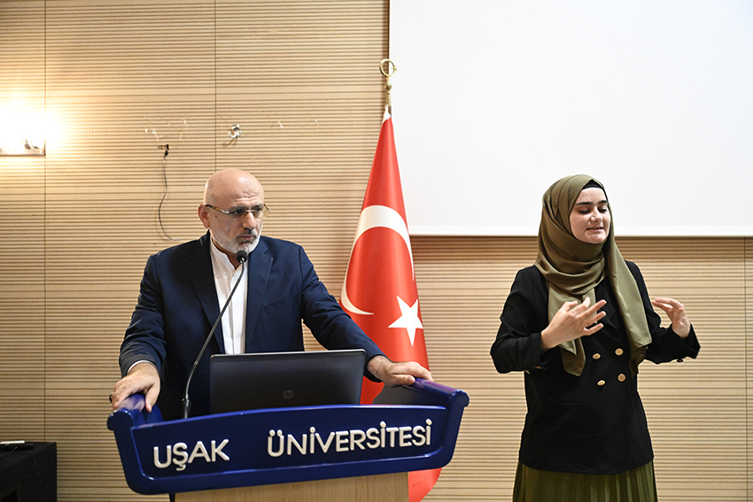 Uşak Üniversitesi İslam Araştırmaları Uygulama ve Araştırma Merkezi, İslami İlimler Fakültesi ve Anadolu İrfanı Öğrenci Topluluğunun birlikte düzenlediği “Semâdan Sînelere Kur’an” konulu konferans Uşak Üniversitesi Mustafa Kemal Paşa Amfisinde gerçekleştirildi. Rektör Yardımcısı Prof. Dr. Osman Birgin, İslami İlimler Fakültesi Dekanı Prof. Dr. Ali Yılmaz, akademisyenler ve öğrencilerin katıldığı programda Saygı Duruşu ve İstiklal Marşı’nın okunmasının ardından İslami İlimler Fakültesi Öğrencisi Melih Çetinkaya Kur’an-ı Kerim tilavet etti.