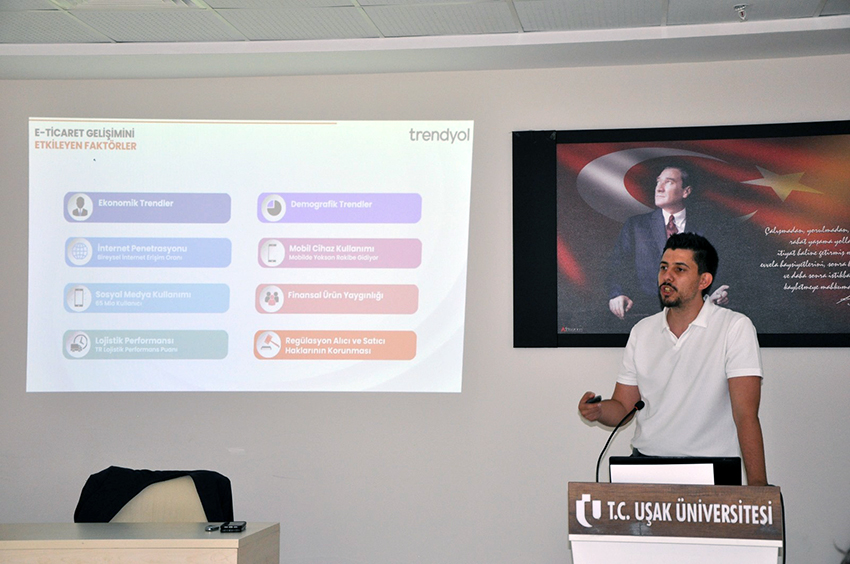 Trendyol Grup Satış ve İş Geliştirme Yöneticisi Nuri Erdoğan, Uşak Üniversitelilerle “E-Ticaret Sohbeti” gerçekleştirdi. Uşak Üniversitesi Teknoloji Transfer Ofisi ve Uşak Ticaret ve Sanayi Odası’nın desteğiyle Uşak Üniversitesi Yeni Medya Atölyesi Topluluğu tarafından düzenlenen etkinlik 6 Haziran 2024 günü Uşak Üniversitesi Recep Tayyip Erdoğan Kongre ve Kültür Merkezinde gerçekleştirildi.