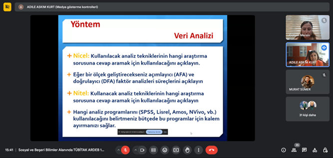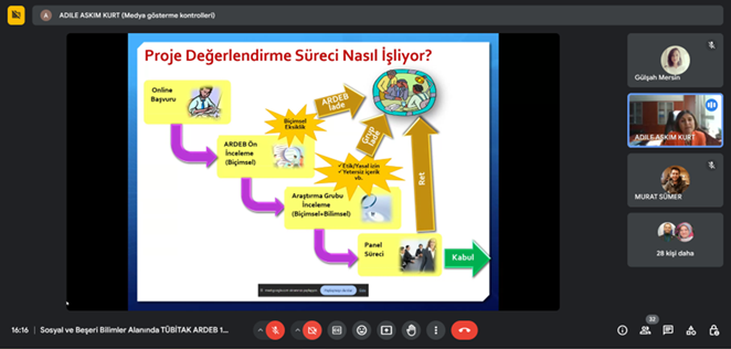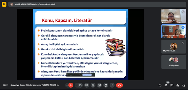 Eğitim kapsamında TÜBİTAK proje destek programları hakkında genel bilgi verildikten sonra, TÜBİTAK ARDEB 1001 projelerinin yazımından bahsedildi. Sosyal Bilimler alanındaki projeler için özgün değer, amaç ve hedefler, yöntem, proje yönetimi, yaygın etki ve proje değerlendirme süreci konuları detaylı olarak anlatıldı.