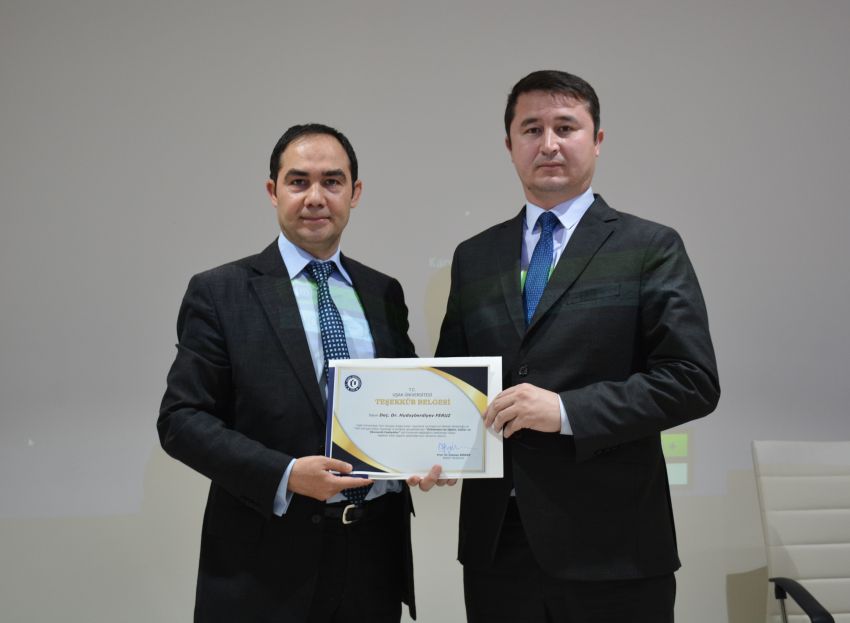 Konferans, soruların cevaplanmasının ardından Türk Dünyası Araştırmaları Uygulama ve Araştırma Merkezi Müdürü Doç. Dr. Kamil Uygun’un Özbekistan Milli Araştırmalar Üniversitesi Buhara Tabii Kaynaklar Enstitüsü Tabii Kaynaklar ve Ekoloji Fakültesi Dekanı Doç. Dr. Hudoyberdiyev Feruz’a günün anısına üniversitemiz adına teşekkür belgesi vermesiyle son buldu.