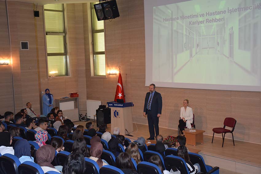 Uşak Üniversitesi Sağlık Bilimleri Fakültesi Sağlık Yönetimi Bölümü ile Uşak Üniversitesi Sürekli Eğitim Uygulama ve Araştırma Merkezi iş birliğiyle Kariyer Haftası etkinlikleri kapsamında “Sağlık Yönetiminde Kariyer” başlıklı etkinlik gerçekleştirildi. Mustafa Kemal Paşa Amfisinde gerçekleşen etkinliğe ilaç ve sağlık sektörünün deneyimli yöneticileri Dr. Alper Dölenmen ve Meltem Yıldız Dölenmen konuşmacı olarak katıldı.