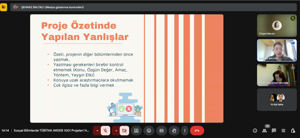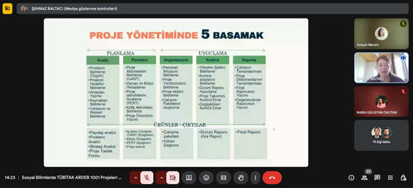 Eğitim kapsamında TÜBİTAK ARDEB 1001 projelerinin hazırlanması, yazımı, projenin uygulanması ve sona erdirilmesi aşamalarını anlatan Prof. Dr. Baltacı, “Sosyal Bilimlerdeki araştırma projeleri için özgün değer, yöntem, proje yönetimi, yaygın etki ve proje değerlendirme süreci konuları büyük önem arz etmektedir. Bu konuların her birine önem vererek projelerin hazırlanması kabul edilme durumunu da olumlu anlamda etkilemektedir.” diye konuştu.