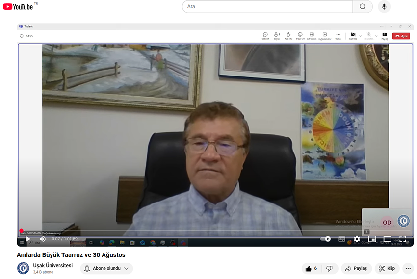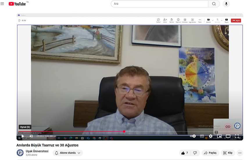 Uşak Üniversitesi tarafından 30 Ağustos Zafer Bayramı dolayısıyla "Anılarda Büyük Taarruz ve 30 Ağustos" adlı konferans gerçekleştirildi. Uşak Üniversitesi Youtube kanalından canlı yayınlanan konferansta, Uşak Üniversitesi İnsan ve Toplum Bilimleri Fakültesi Dekanı Prof. Dr. Sadık Sarısaman, 30 Ağustos Zaferi öncesi yapılan hazırlıkları ve savaş esnasında yaşananları anlattı.