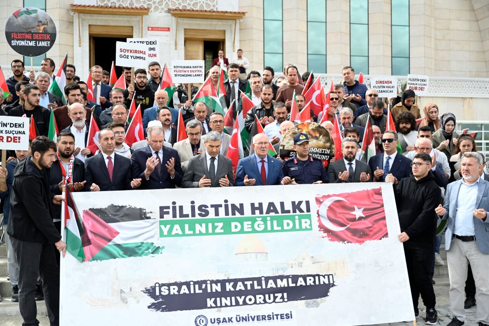 Uşak Üniversitesi’nde Cuma namazı sonrası Gazze ve Filistin halkı için özel bir dua programı gerçekleştirildi. Uşak Üniversitesi İlahiyat Fakültesi camisinde düzenlenen etkinliğe Uşak Valisi Dr. Naci Aktaş, Uşak Üniversitesi Rektörü Prof. Dr. Ekrem Savaş, il protokolü, üniversite yönetimi, akademisyenler, idari personel, Sivil Toplum Kuruluşları (STK) temsilcileri ve öğrenciler katıldı.