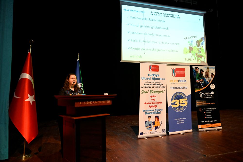Uşak Üniversitesi Erasmus Konsorsiyumu ve Bütçe Sorumlusu Atike Uçan ise, yaptığı sunumda programın mali ve idari işleyişini aktardı. Öğrencilere başvuru sürecinde dikkat edilmesi gereken noktalar hakkında bilgi veren Uçan, Erasmus’un sadece bir öğrenim hareketliliği olmadığını, aynı zamanda öğrencilerin farklı kültürleri tanıyarak özgüven kazandıkları bir gelişim süreci olduğunu belirtti.