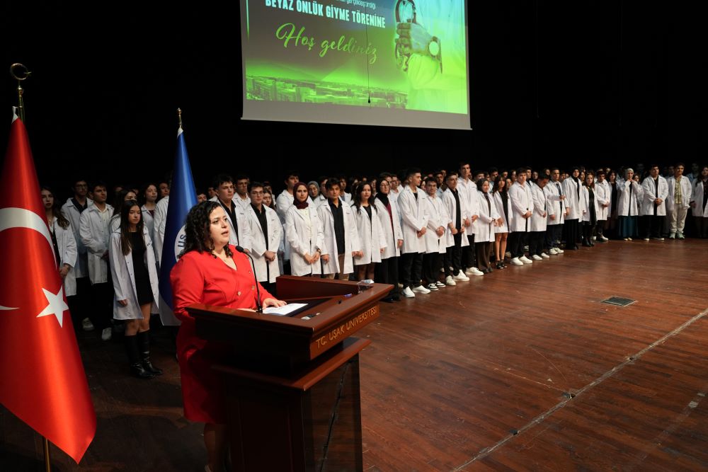 Prof. Dr. Taş, “Geleneksel Beyaz Önlük Giyme Töreni’nde hepinizi şahsım ve Uşak Üniversitesi Rektörü adına en içten duygularımla selamlıyorum. Genç hekim adayları, bu önlüğü giymek artık insan hayatının sorumluluğunu da taşımaya hazırım anlamına geliyor. Bilimsel bilgiler kadar etik değer, empati ve insan sevgisi de bu mesleğin özünü oluşturur. Bugün giydiğiniz beyaz önlük, size bilimin ışığını, vicdanın sesini ve insanlığa hizmet etme görevini hatırlatacak. Tüm öğrencilerimizi gönülden kutluyorum, yolunuz açık, yüreğiniz aydınlık olsun.” Dedi.