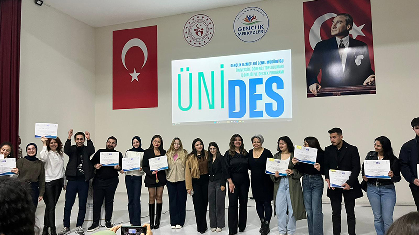 Gençlik ve Spor Bakanlığı Gençlik Hizmetleri Birimi tarafından genç ofislerin üniversite öğrenci topluluklarıyla etkileşimini artırmak ve gençlerin gelişimine yönelik faaliyetleri desteklemek amacıyla hayata geçirilen yürütülen ÜNİDES programı kapsamında sertifika töreni gerçekleştirildi. Törene üniversite topluluklarının temsilcileri, gençlik liderleri, proje yürütücüleri ve çok sayıda öğrenci katıldı.