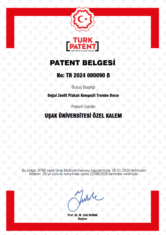 Uşak Üniversitesi, bilimsel üretim, yenilikçilik ve toplumsal katkı odaklı araştırma vizyonu doğrultusunda önemli bir başarıya daha imza attı. Üniversitemiz, “Doğal Zeolit Plakalı Kompozit Trombe Duvar” başlıklı yenilikçi buluşu için Türk Patent ve Marka Kurumu tarafından 2024/000090 başvuru numarası ile Patent Belgesi almaya hak kazandı.