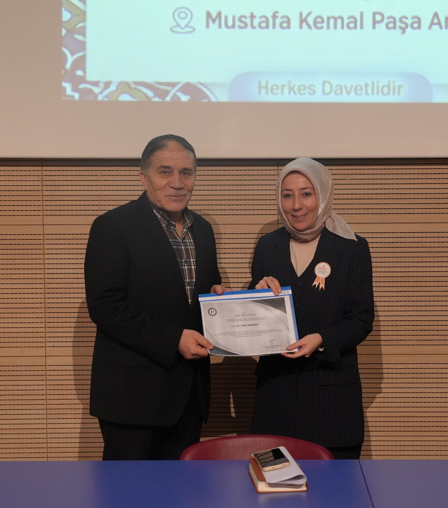 Program sonunda konuşmacılara teşekkür belgeleri Uşak Üniversitesi İlahiyat Fakültesi Dekanı Prof. Dr. Sayın Dalkıran tarafından takdim edildi ve panel toplu fotoğraf çekimiyle tamamlandı.