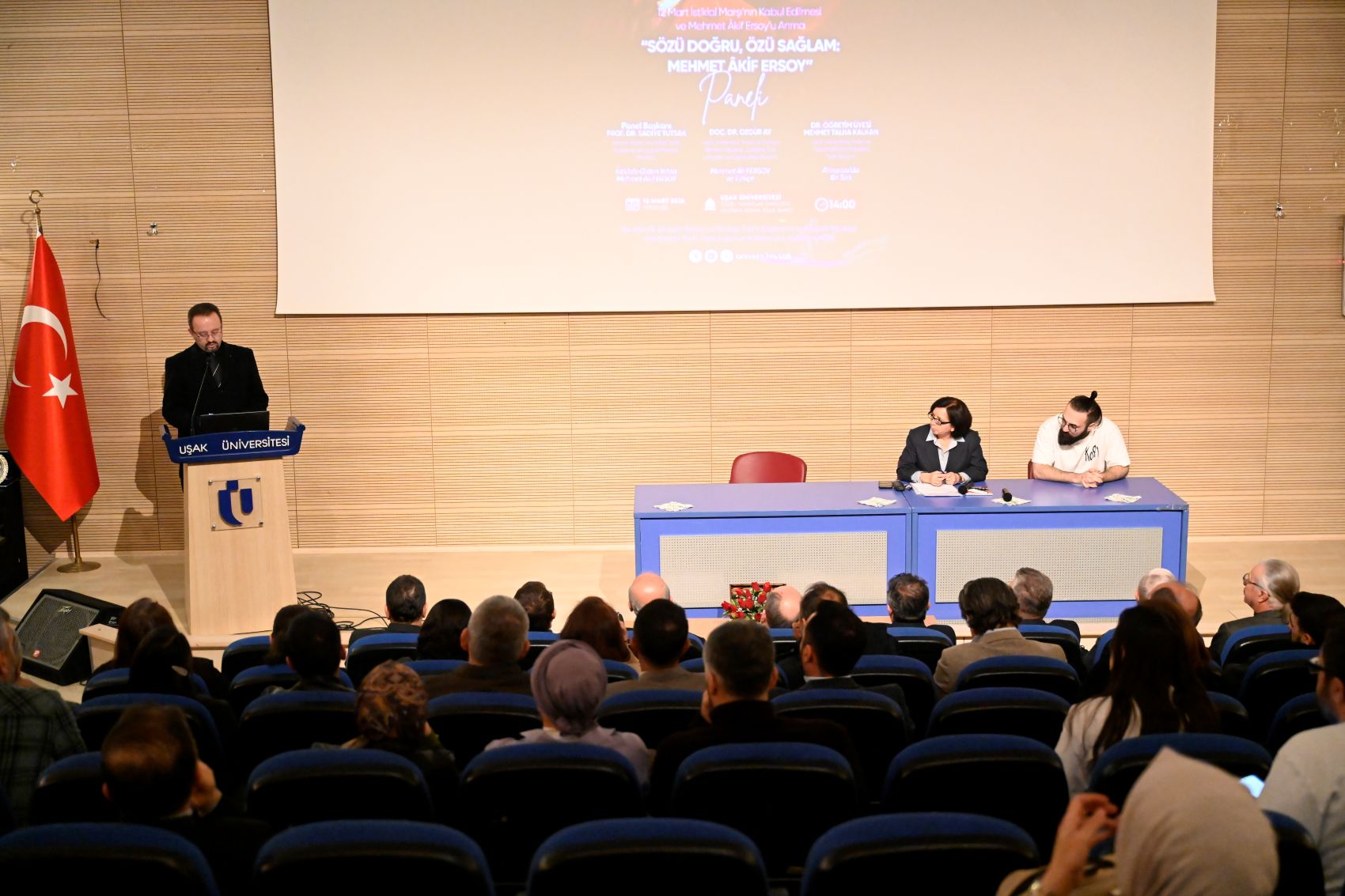 Türk milletinin bağımsızlık mücadelesinin simgelerinden biri olan İstiklâl Marşı’nın kabulünün 105. yılı kapsamında Uşak Üniversitesinde ‘‘Sözü Doğru, Özü Sağlam: Mehmet Akif Ersoy’’ konulu panel düzenlendi. Programda, milli şair Mehmet Akif Ersoy saygı ve rahmetle anıldı.